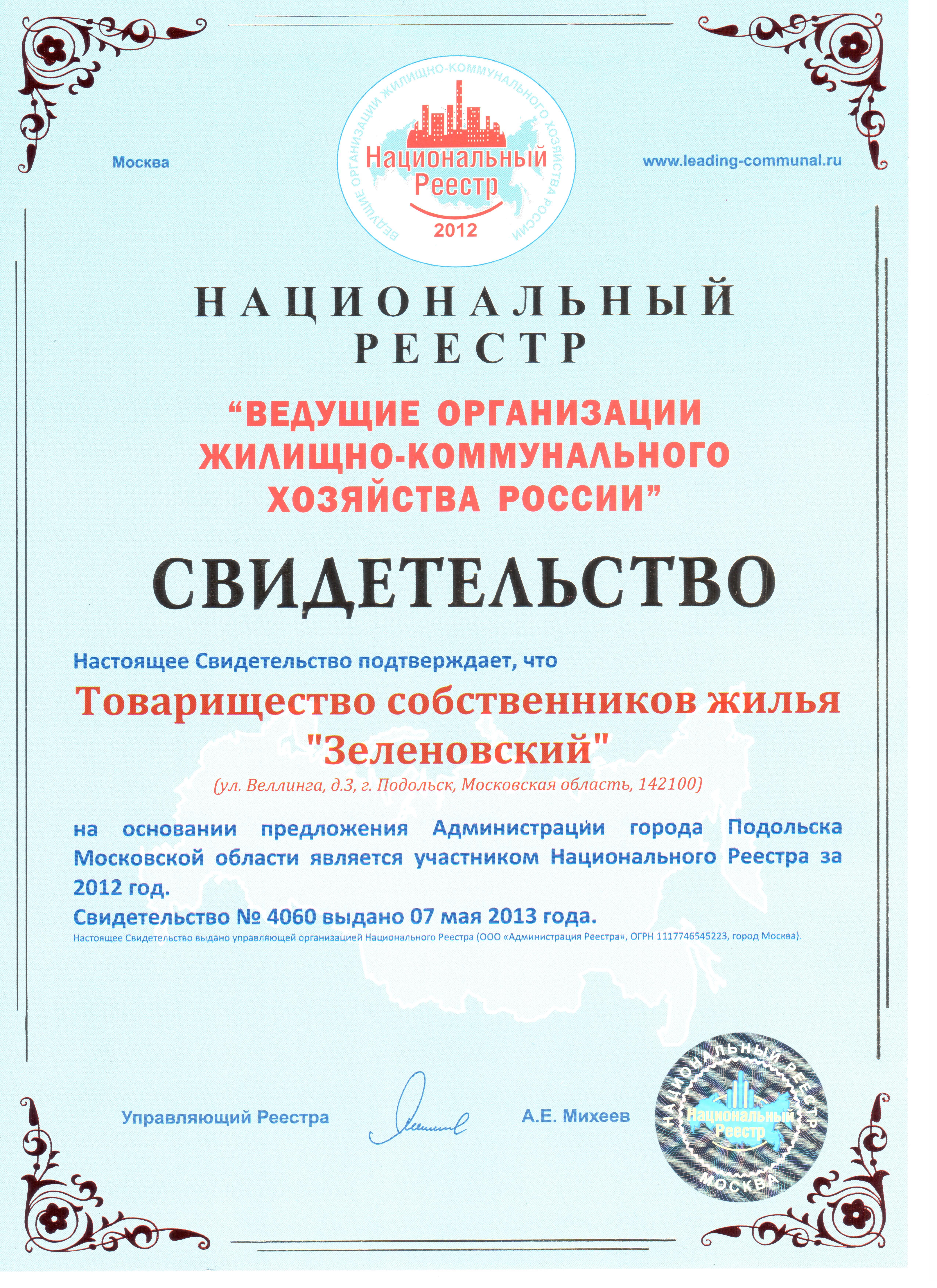 Полное наименование: Товарищество собственников недвижимости (жилья) "Зеленовский"